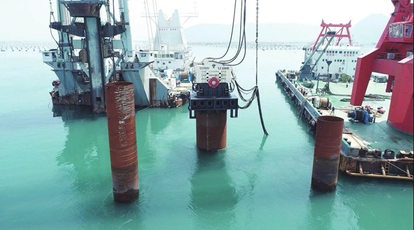 为应对原配IHCS800型液压冲击锤正在施工中可能对大黄鱼养殖区形成的冲击波影响,团队自从立异研发“打桩船﹢液压振动锤”集成沉桩工艺,将ICE170NF液压振动锤取雄程3号打桩船连系,实现高频低噪功课,既降低了对生态的扰动,又保障了施工精度?。